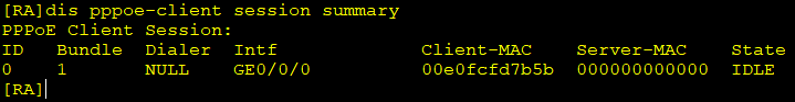 Huawei\]undo info-center ena Info: Information center is disabled. \[Huawei\]sysn RA \[RA\]int g0/0/1 \[RA-GigabitEthernet0/0/1\]ip add 192.168.10.254 24 \[RA-GigabitEthernet0/0/1\]qu 2、配置Dialer接口 \[RA\]int Dialer 0 \[RA-Dialer0\]link-protocol ppp \[RA-Dialer0\]ppp chap user admin \[RA-Dialer0\]ppp chap password cipher 123456 \[RA-Dialer0\]ip add ppp-negotiate \[RA-Dialer0\]tcp adjust-mss 1200 //最大报文长度 \[RA-Dialer0\]ip address ppp-negotiate //允许接口进行地址协商 \[\[RA-Dialer0\]dialer user admin //指定Dialer接口拨号使用的用户名 RA-Dialer0\]dialer bundle 1 //指定Dialer接口的编号 \[RA-Dialer0\]dialer timer idle 300 INFO: The configuration will become effective after link reset. \[RA-Dialer0\]dialer-group 1 //将该接口置于一个拨号组,并进行编号 \[RA-Dialer0\]qu 3、配置拨号规则dialer-rule \[RA\]dialer-rule \[RA-dialer-rule\]dialer-rule 1 ip permit \[RA-dialer-rule\]qu 4、建立PPPoE会话 \[RA\]int g0/0/0 \[RA-GigabitEthernet0/0/0\]pppoe-client dial-bundle-number 1 //将G0/0/0与VT1绑定 \[RA-GigabitEthernet0/0/0\]qu 5、配置NAT转换,配置局域用户通过NAT转换将私网地址转换为公网地址,并配置进行拨号上网的基本访问控制列表 \[RA\]acl number 3000 \[RA-acl-adv-3000\]rule 5 permit ip source 192.168.10.0 0.0.0.255 \[RA-acl-adv-3000\]qu \[RA\]int Dialer 0 \[RA-Dialer0\]nat outbound 3000 \[RA-Dialer0\]qu 6、配置到PPPoE Server的静态路由 RA\]ip route-static 0.0.0.0 0 Dialer 0 三、任务验收 1、在ISP上查看PPPoE会话信息  2、在RA上查看PPPoE会话信息  3、测试计算机的互通性