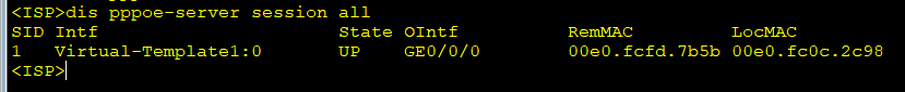 ISP\]ip pool pppoe Info: It's successful to create an IP address pool. \[ISP-ip-pool-pppoe\]gateway-list 20.20.20.1 \[ISP-ip-pool-pppoe\]network 20.20.20.0 mask 255.255.255.0 \[ISP-ip-pool-pppoe\]qu 3、配置PPPoE认证用户,实现PPPoE对用户主机的认证 \[ISP\]aaa \[ISP-aaa\]local-user admin password cipher 123456 \[ISP-aaa\]local-user admin privilege level 0 \[ISP-aaa\]local-user admin service-type ppp \[ISP-aaa\]qu 4、配置虚拟接口模板VT,本端PPPoE协议对对端设备的认证方式为CHAP \[ISP\]int Virtual-Template 1 //创建VT接口,编号可以自定义,这组设置为1 \[ISP-Virtual-Template1\]ppp authentication-mode chap \[ISP-Virtual-Template1\]remote address pool pppoe //为PPPoE Clent指定IP地址池 \[ISP-Virtual-Template1\]ip add 20.20.20.1 24 \[ISP-Virtual-Template1\]qu 5、启用PPPoEServer功能。在以太网接口G0/0/0上启用PPPoE功能 \[ISP\]int g0/0/0 \[ISP-GigabitEthernet0/0/0\]pppoe-server bind virtual-template 1 //将G0/0/0和VT接口绑定 \[ISP-GigabitEthernet0/0/0\]qu \[ISP
