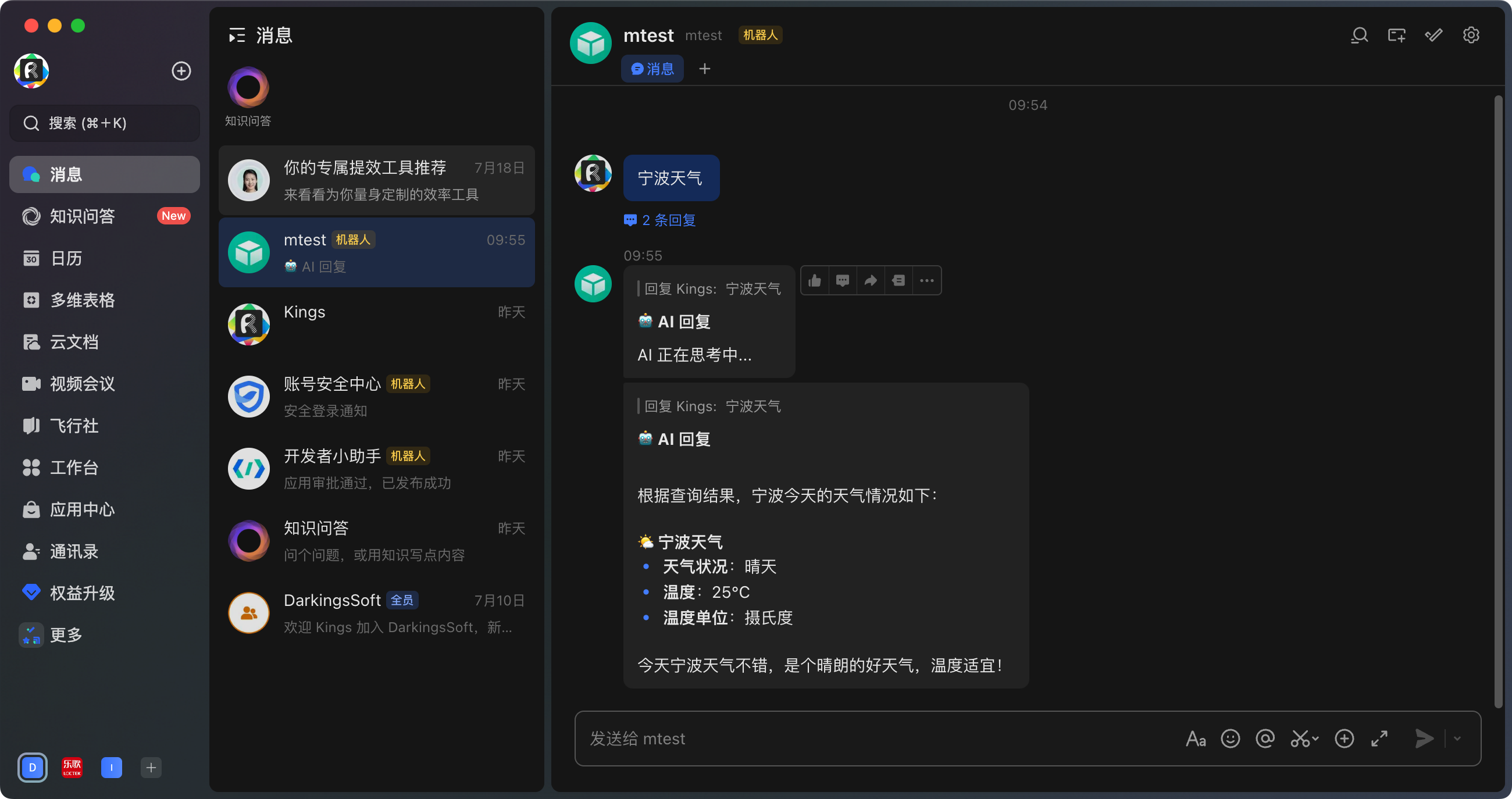 启动成功后在飞书应用里输入例如北京,等待机器人回复