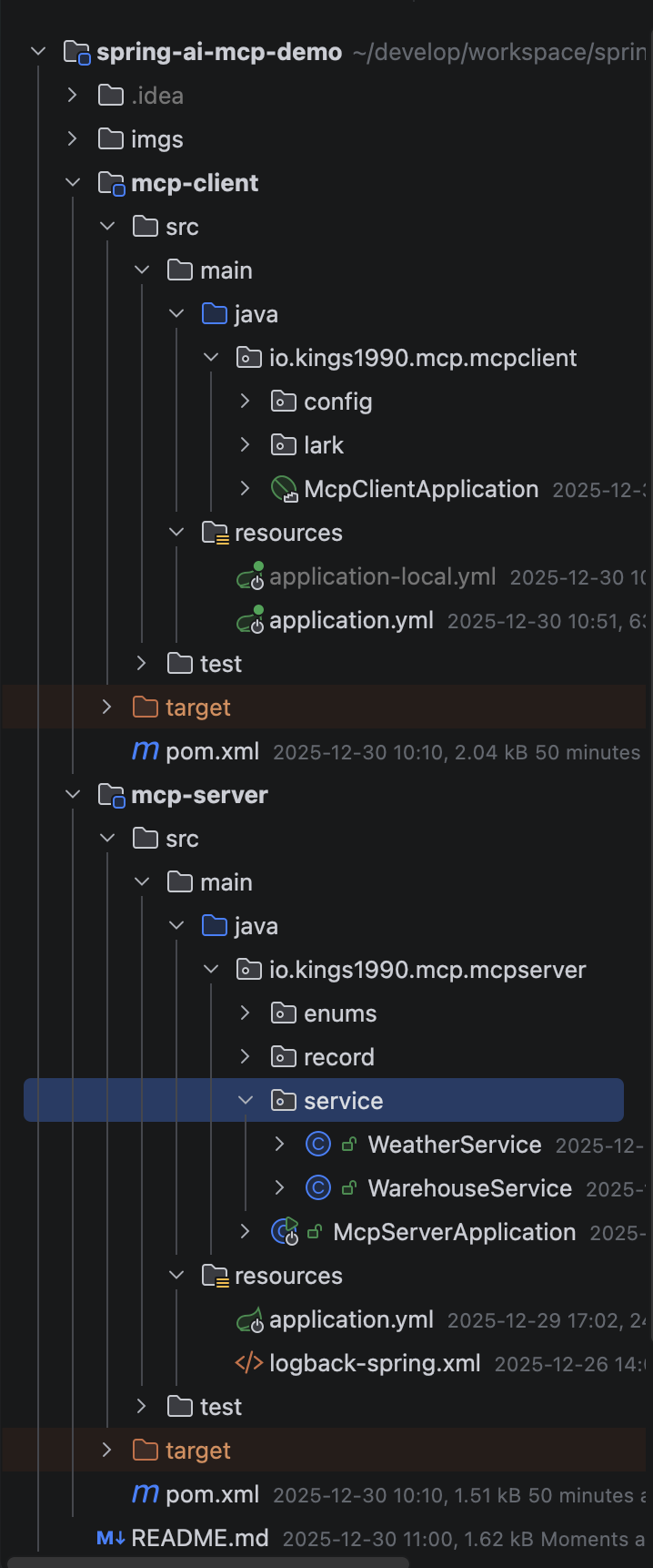 主要分为2个模块,mcp-server 和 mcp-client, mcp-client里面通过 java -jar 的形式运行 mcp 服务端,在 mcp-client 最终结合 AI 以及飞书机器人的集成实现消息的回复.