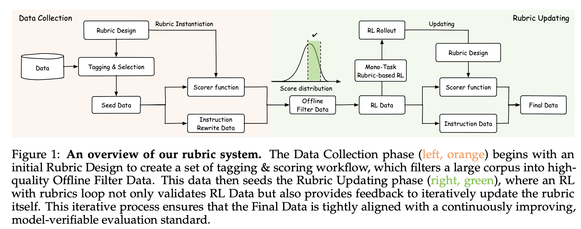 - 左边橙色:Data Collection(数据收集)------先设计初始评分细则(rubric),从海量语料里筛出高质量的"种子数据"。