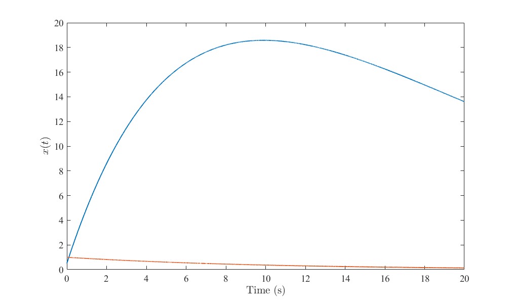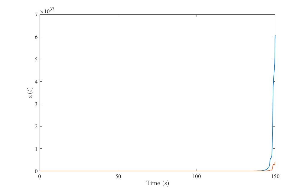 可以看到,按照传统的控制器设计方法开环系统2在控制器的作用下能逐渐收敛镇定,但是系统1却求不出控制器增益没有相应控制方式。