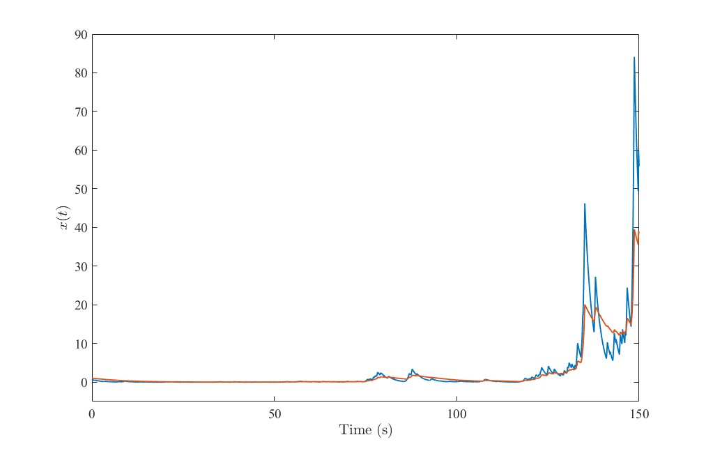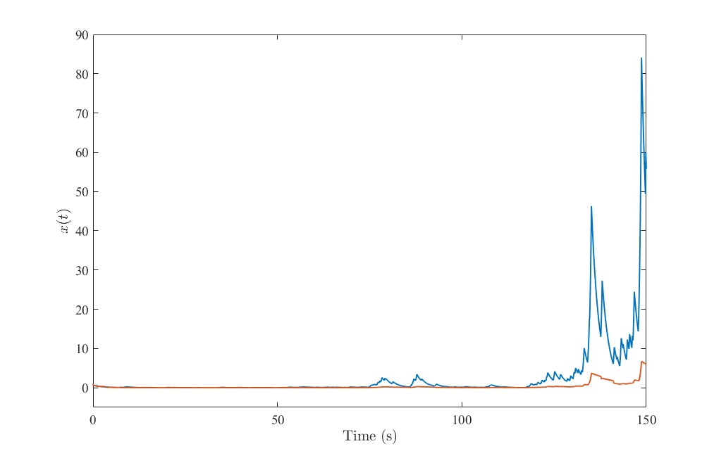 与之对比,如果不考虑转移概率信息,可以通过LMI求得模态2下的控制器增益,但是模态1下的控制器增益是无解的。也就是说,我们只能对模态1下的系统不设控制器,或者用模态2的控制器。