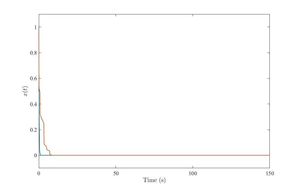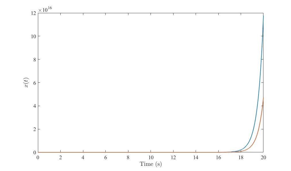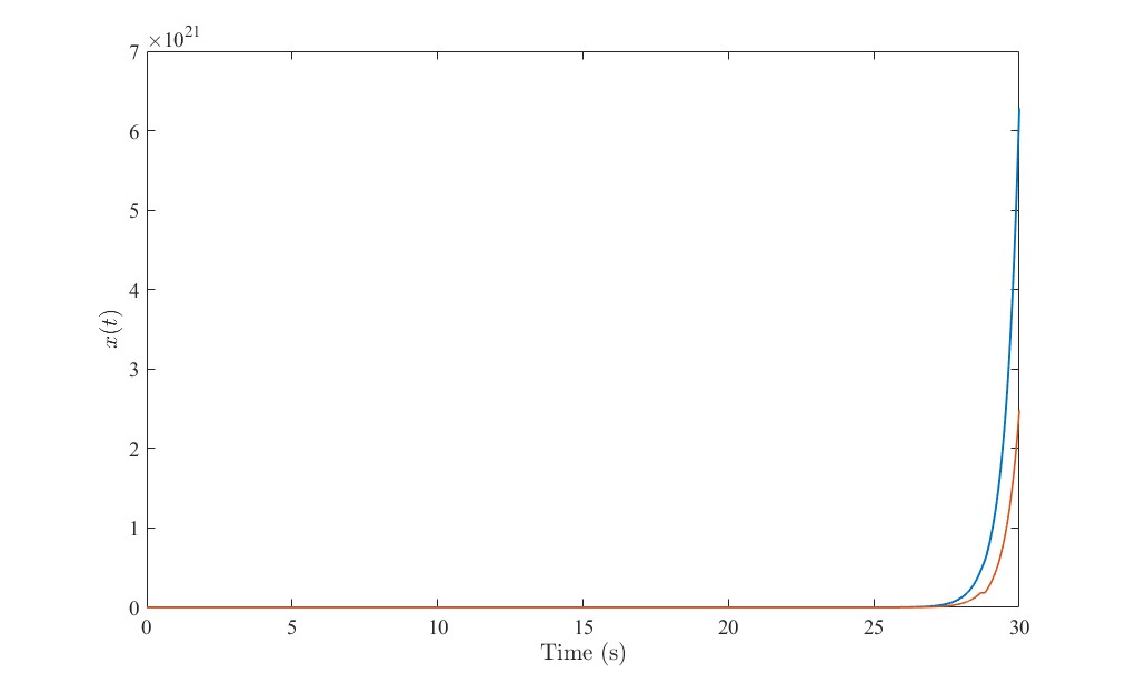 可以发现,由于系统在不稳定的模态1下运行的时间减少,其发散速度有所减缓,但是系统仍旧是发散的,需要用LMI设计控制器来镇定。