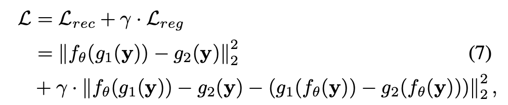 因为有下采样的策略,网络没有看到全局信息,所以还有一个正则项:去噪后再采样结果和采样后去噪点结果要保持一致性,所以得到: