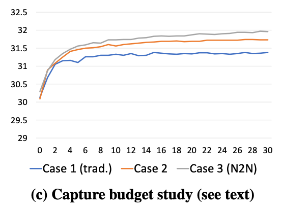 case1是传统的监督学习,场景N=100,每个clean img需要19个noisy imga叠加,叠加后与剩下的那个noisy img构成训练对,所以一共需要2000个noisy img。同样是100个场景,每个场景的noisy img可以有20*19种组合,组合后送入N2N学习,这就是Case2,可以看到效果有提升。仍然保持2000个"capture unit" (CU),拆成1000个场景,每个场景2个noisy imga,这就是case3,可以看到效果在case2的基础上还有提升。