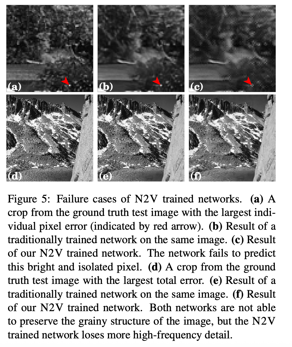因为N2V主动舍弃了中心像素的信息,所以当信号不是那么规则时(比如有一个孤立的点,或者全局都分布很不规则),容易预测出错: