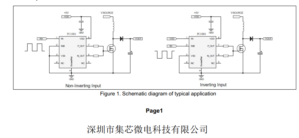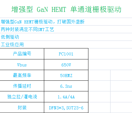 PC1001 是一款单通道高速驱动器,具有 5V 输出和专用增强型氮化镓(GaN)场效应晶体管(FET)驱动功能。PC1001 可提供非对称峰值电流驱动能力,源电流为 1.4A,灌电流为 4A,分别可优化器件的导通和关断时间。PC1001 提供反相和非反相输入,以满足单个器件类型中对反相和非反相门驱动的需求。当输入引脚悬空时,内部输出上拉和下拉电阻会使输出保持低电平。PC1001 具有欠压锁定功能,在 VDD 电源电压进入工作范围之前,可使输出保持低电平。