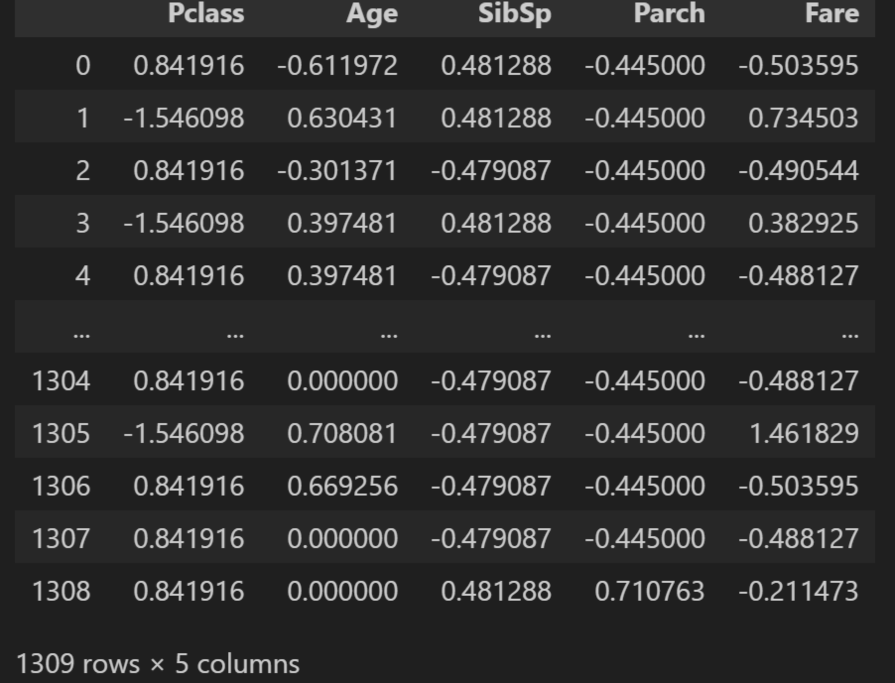 接下来我们对数值类型的那5个属性数据部分进行标准化处理: