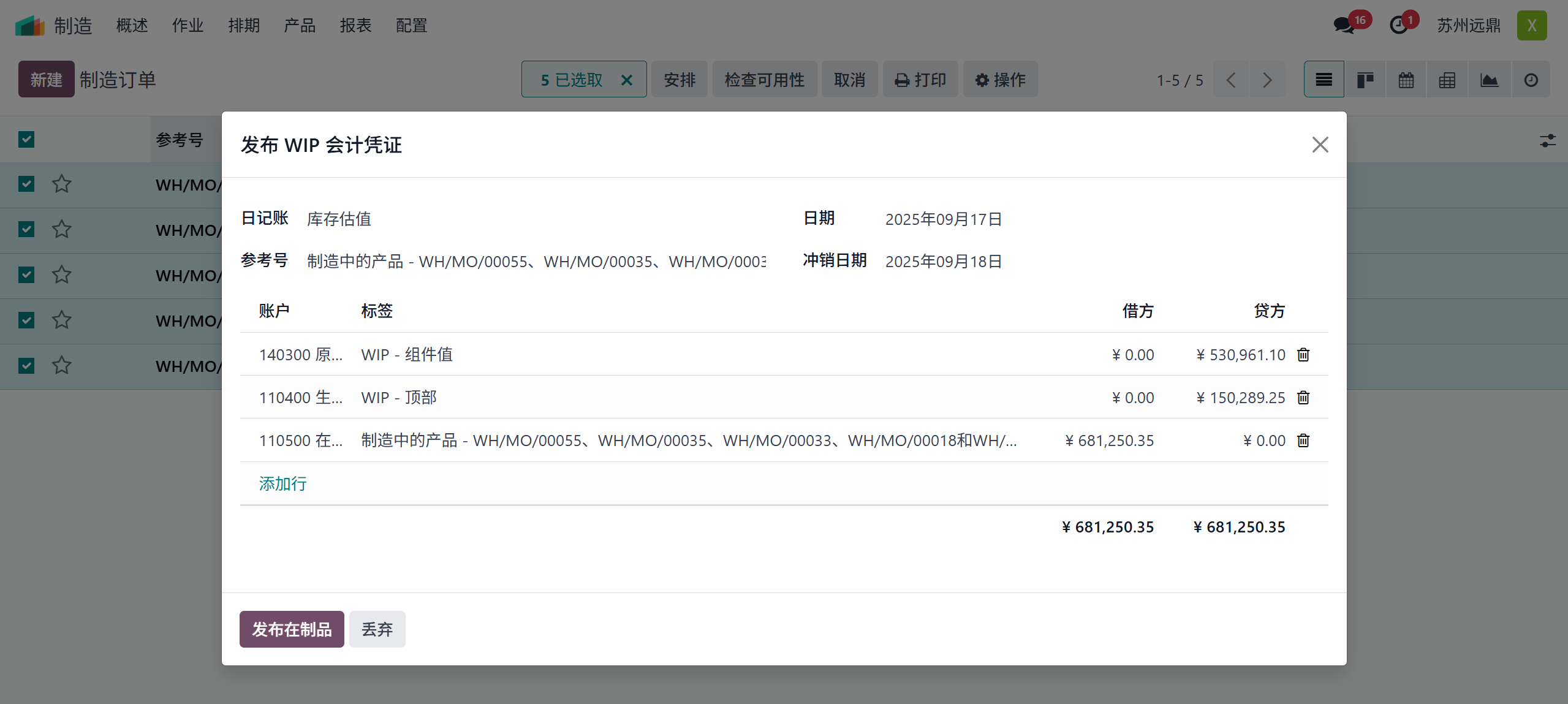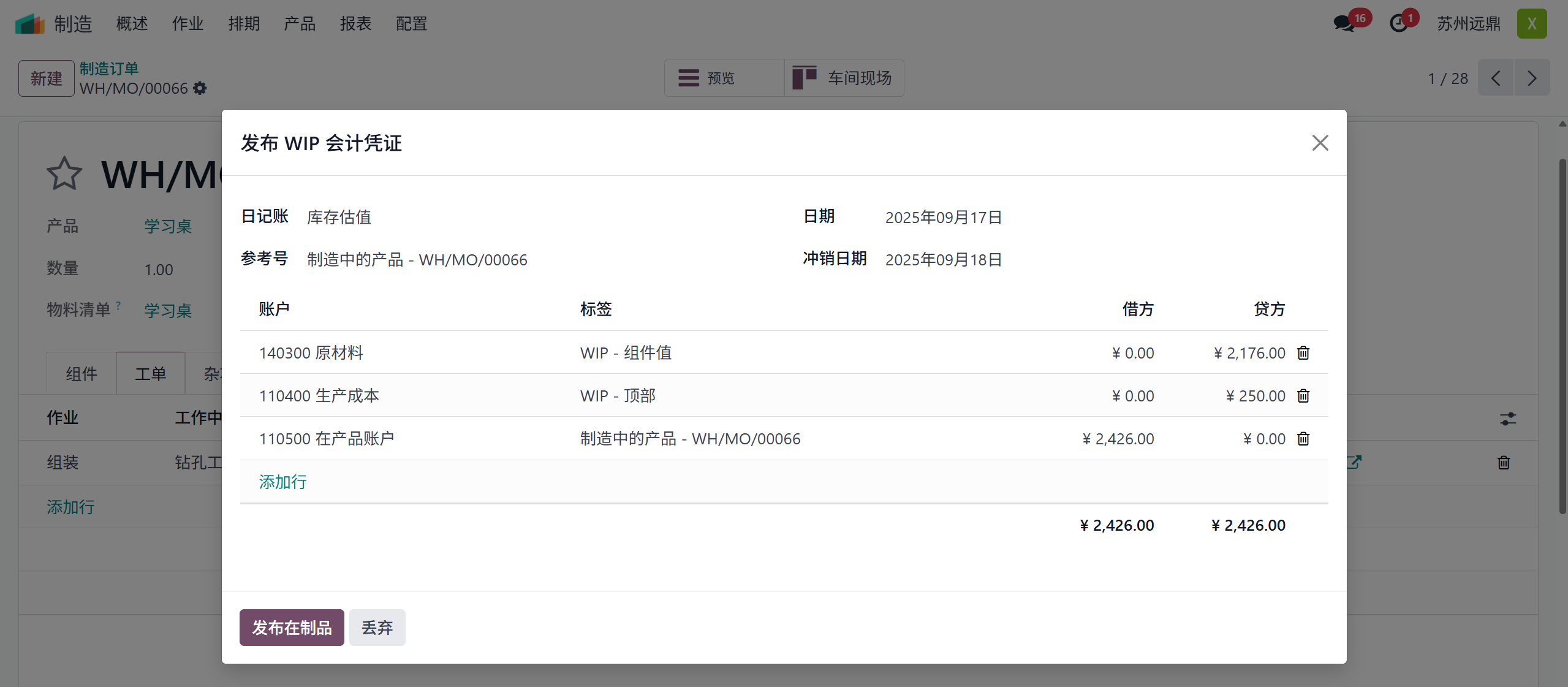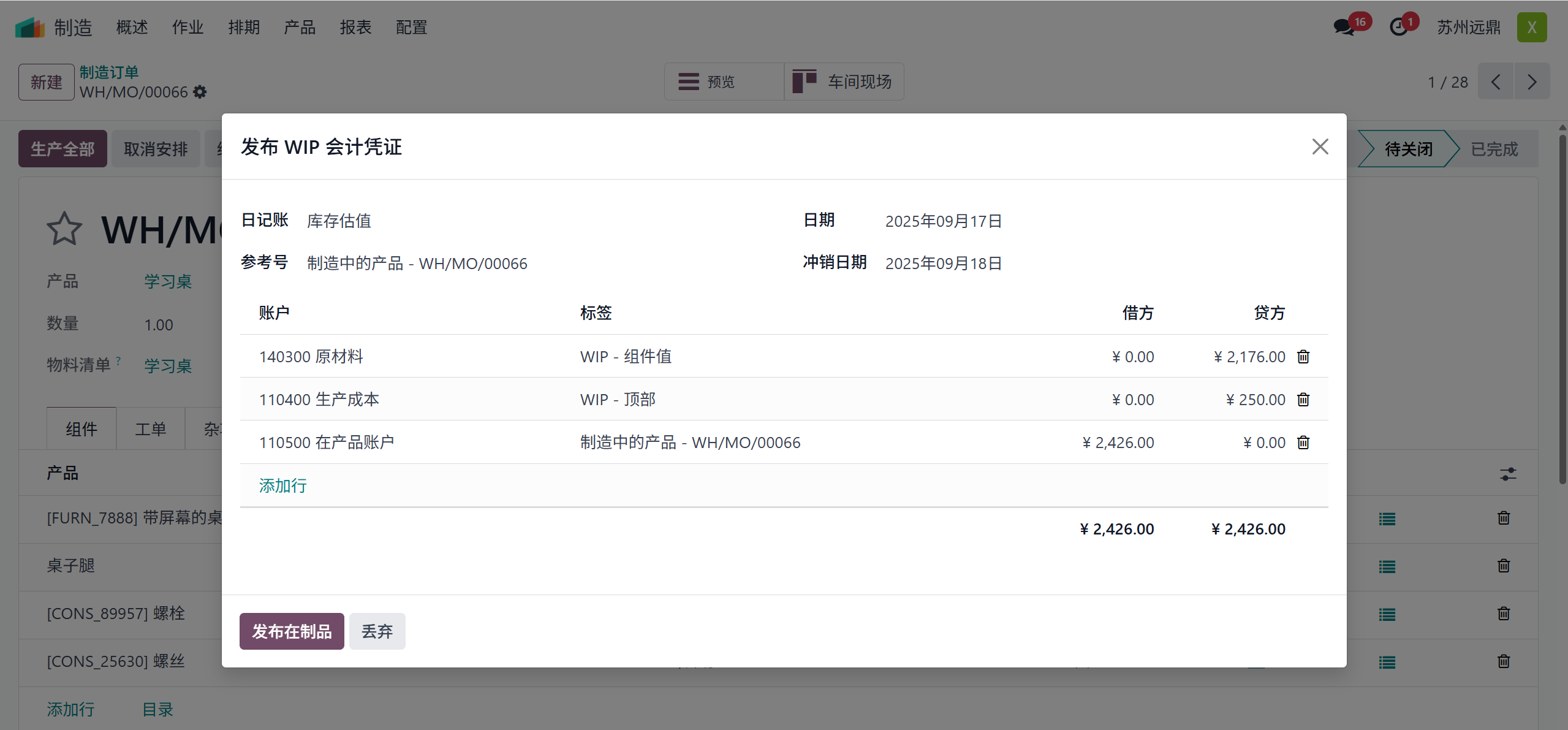 上面的截图显示了凭证条目。显示了原材料账户 、WIP 间接费用账户 和 WIP 账户。用户可以点击"发布在制品"(Post WIP) 按钮来过账凭证。但这里操作尚未完成,所以目前用户放弃了(discard)该凭证。