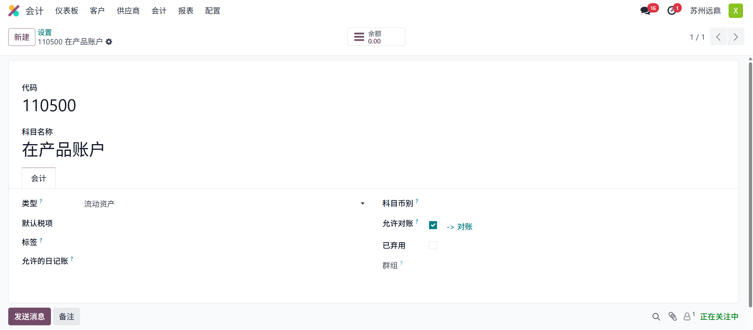 这里的第一个账户是 WIP 账户。点击账户的内部链接,将会打开会计科目表。这里账户名称为"在产品账户"(Work in Progress Account),代码为 110500。账户类型为流动资产(Current Asset)。
