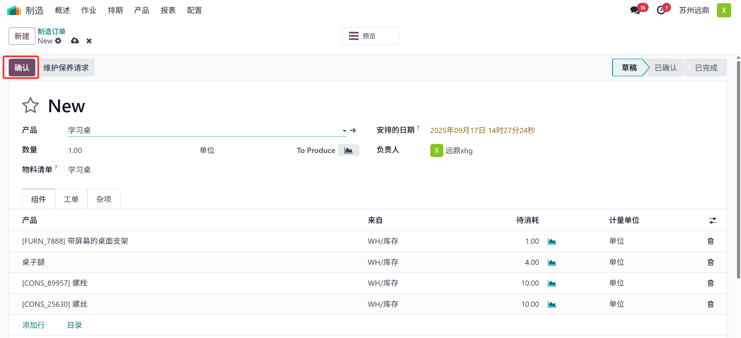 在产品字段中选择相同的产品学习桌。然后选择已创建的物料清单。之后,添加到 BoM 中的所有原材料和工序都会显示在相应区域。