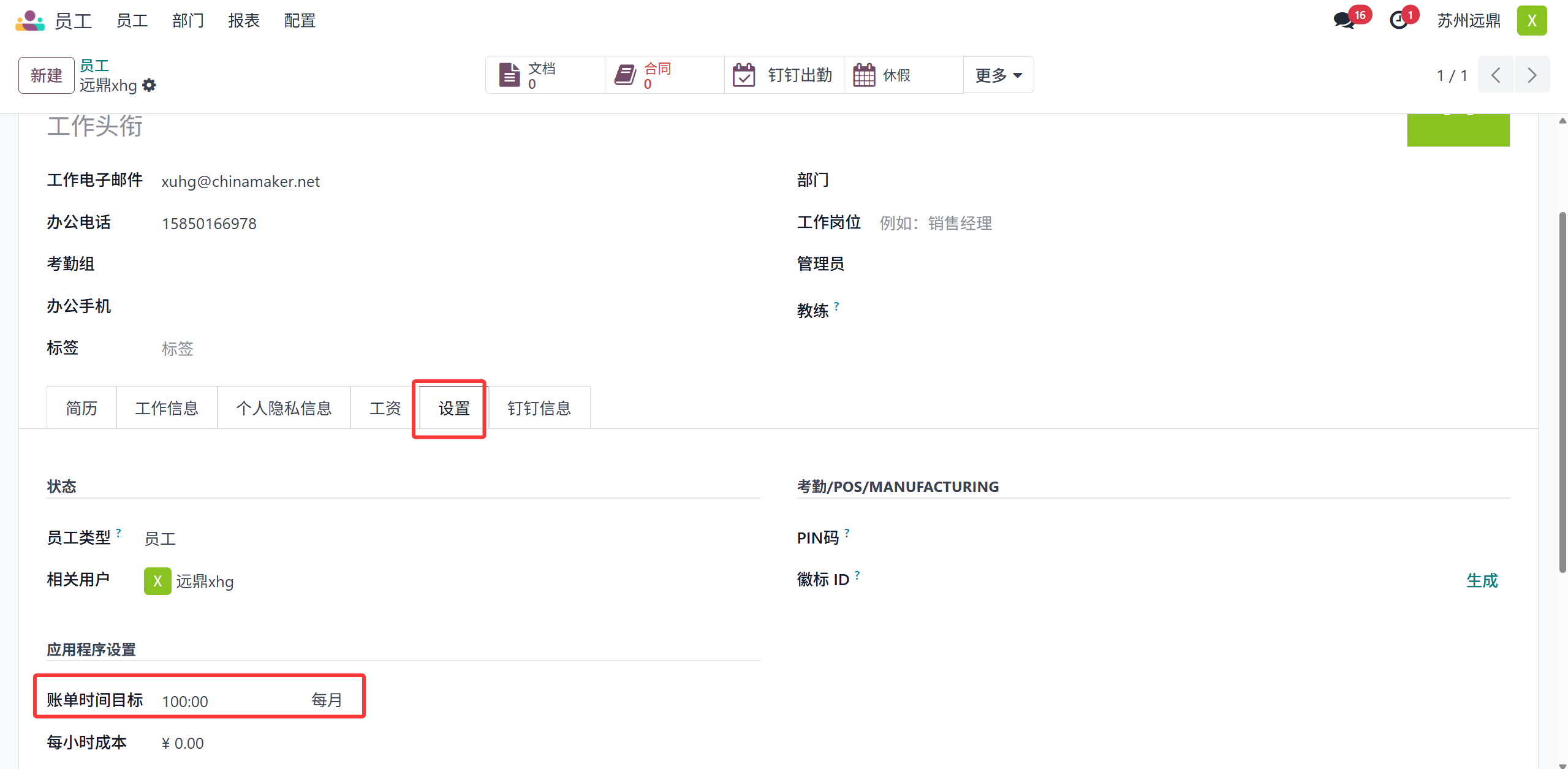 导航到员工模块并打开特定员工 远鼎xhg 以查看员工成本。员工的小时成本显示在 employment 表单的"设置"(Settings) 选项卡上。每小时成本为 100 人民币。