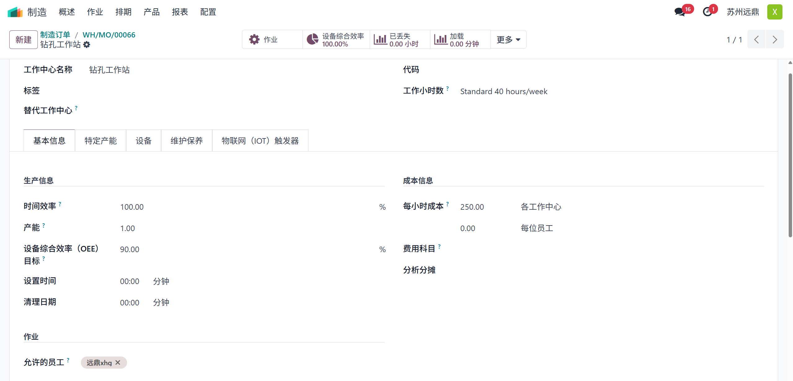 这里,工作中心是 DRILL STATION。此外,检查成本数据可知,每个工作中心每小时成本为 250 人民币。这意味着如果在该工作中心内的产出需要一小时,成本应为 250 人民币。远鼎xhg 也被列为允许的员工 (Allowed Employee)。
