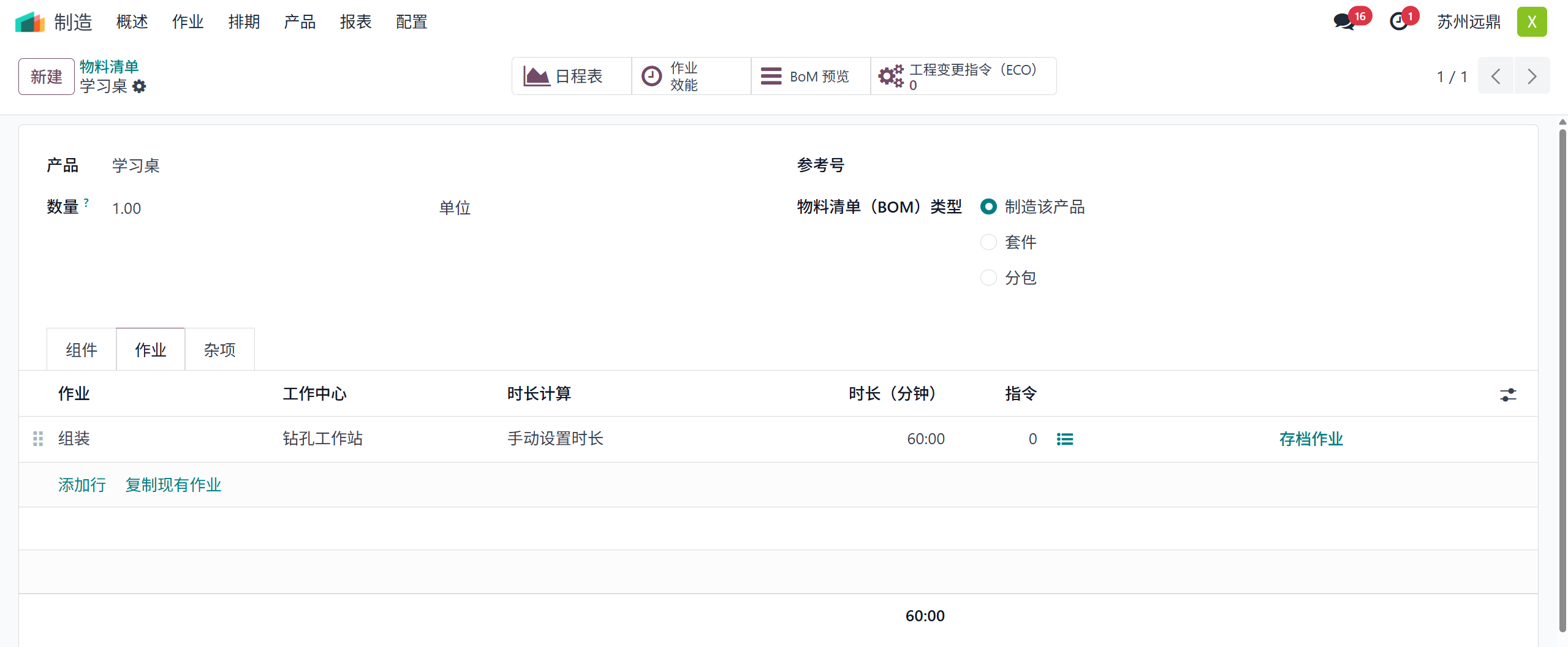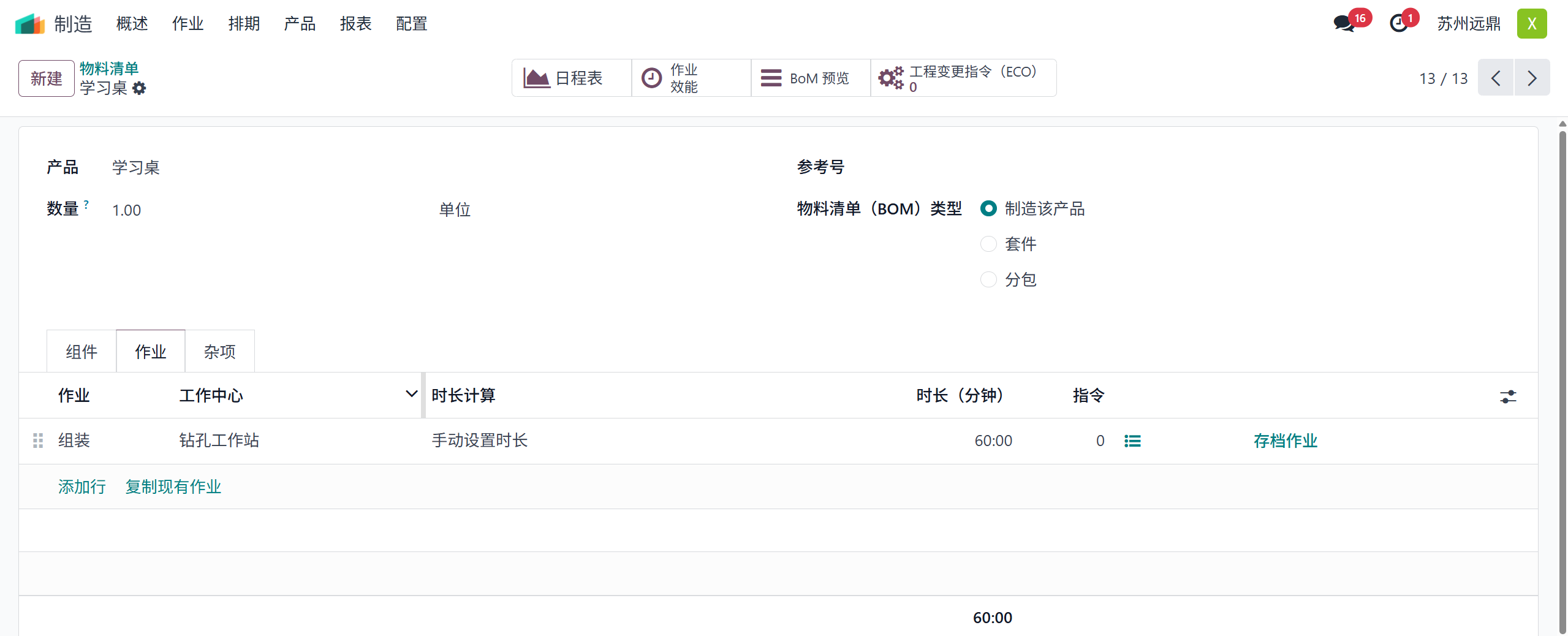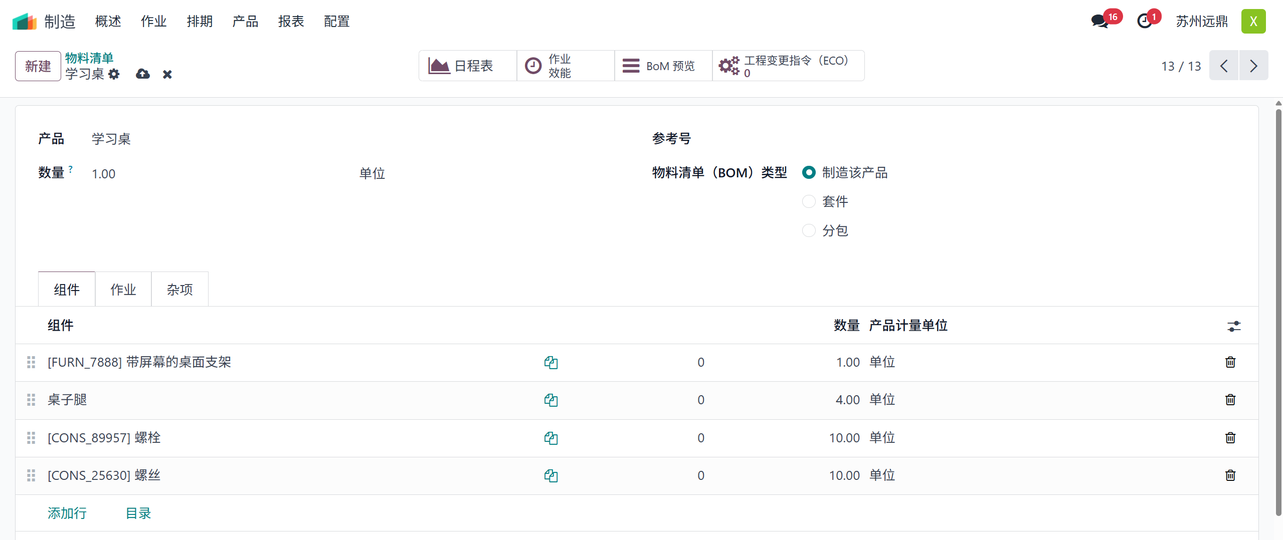 下面的截图显示了一个产品学习桌的物料清单。选择的 BoM 类型是生产此产品。"组件"(Component) 选项卡包含带有数量的原材料列表。