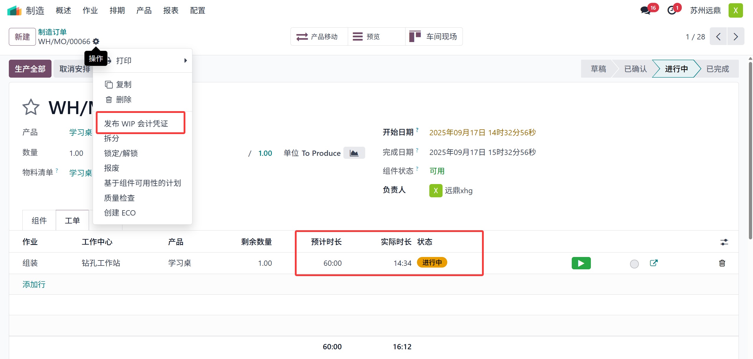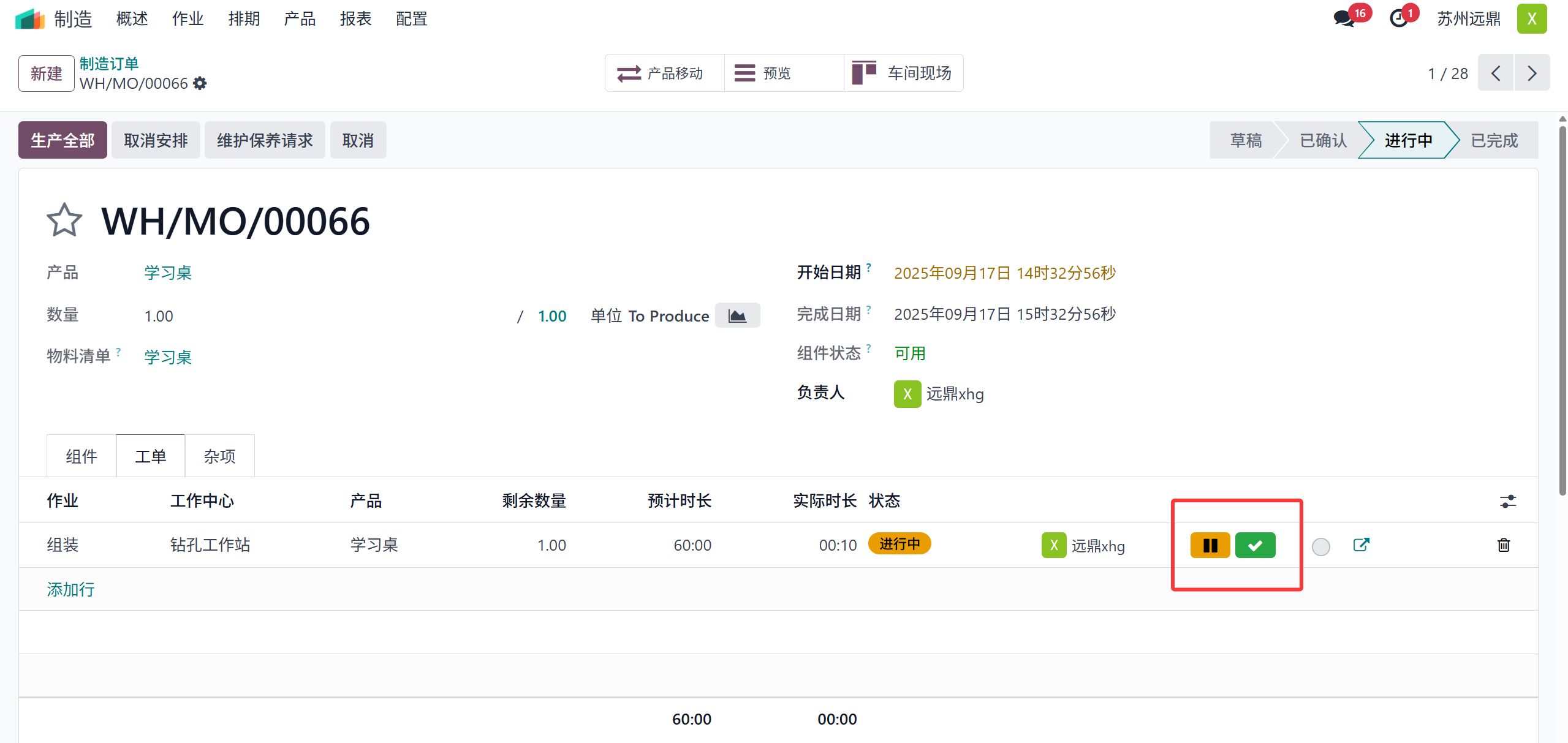 这里,用户只是暂停了工作订单。所以工作订单仍处于"进行中"(In progress) 阶段。这里完成操作的"预计持续时间"(Expected Duration) 设置为 60:00 分钟,但"当前时间"或"实际持续时间"(Real Duration) 是 16:12 分钟。