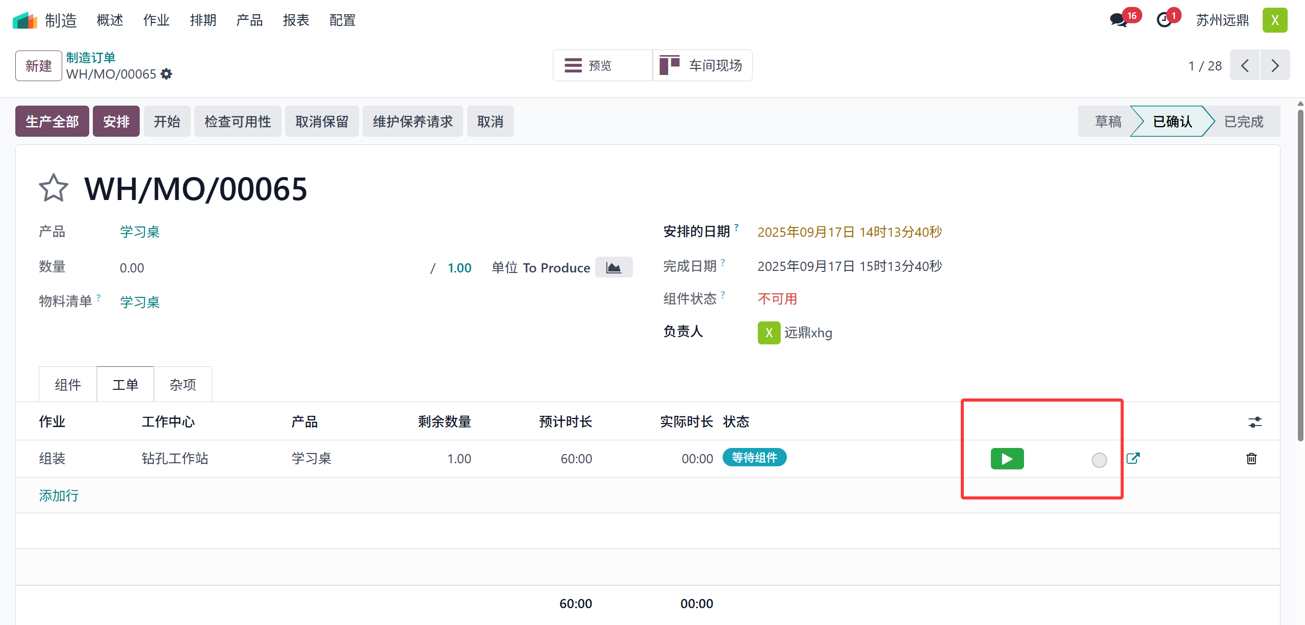点击"确认"(Confirm) 按钮并计划操作。这样生产订单的阶段变为"已确认"(Confirmed)。如下面的截图所示,操作中有一个"开始"(Start) 按钮。要开始工作订单,点击"开始"按钮。