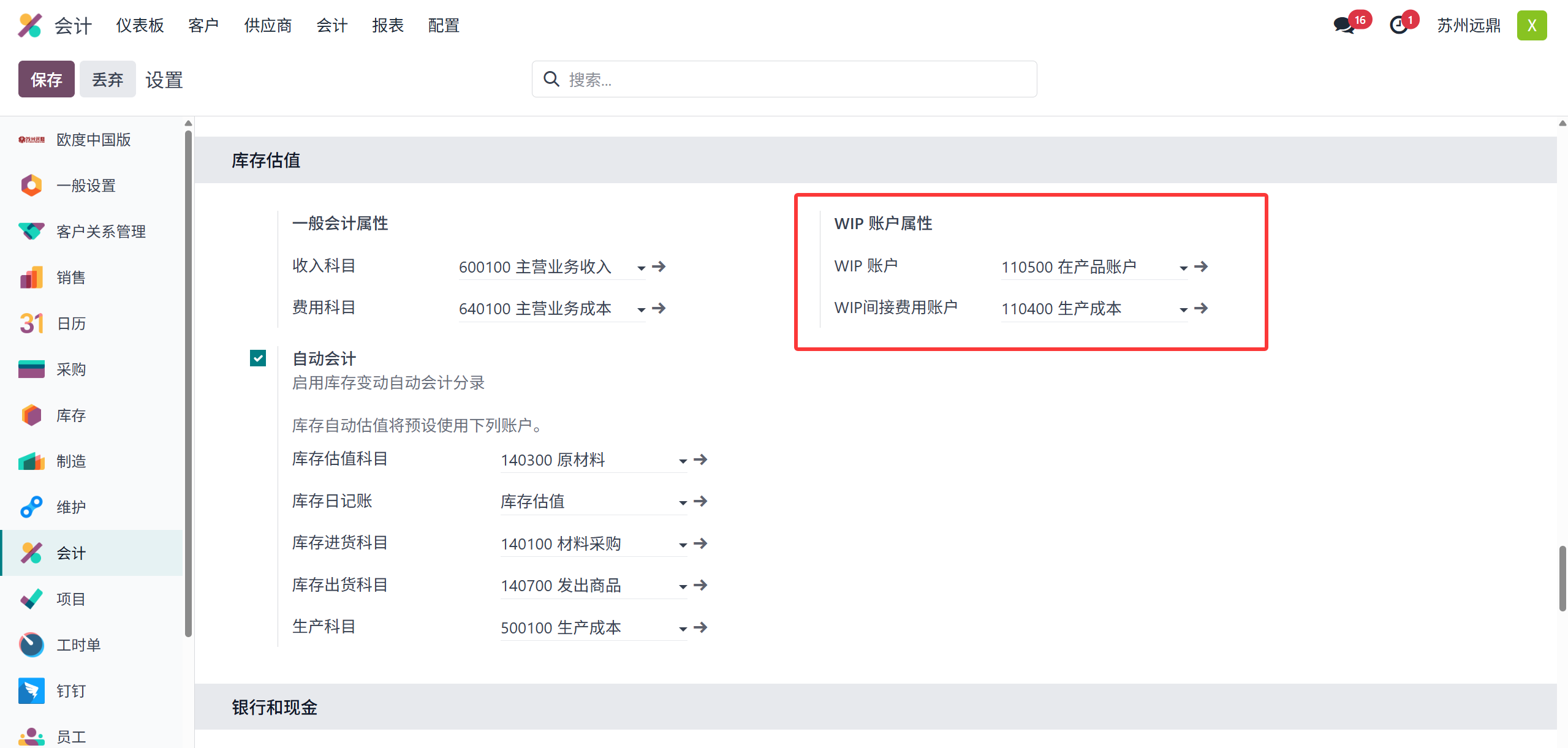 在会计核算中,在产品(Work-in-Progress, WIP)账户 对于精准监控未完工项目或生产流程至关重要。它们通过提供部分完成的物品或服务的价值洞察,来保证准确的财务报告。Odoo 18 中的 WIP 账户有助于追踪持续成本(如人工和材料),而无需过早确认收入。这一功能能帮助企业制定合理的财务决策,并始终遵守会计准则。此外,通过将进行中的工作与已完成的活动分开,WIP 账户有助于改进项目成本管理和盈利能力分析。