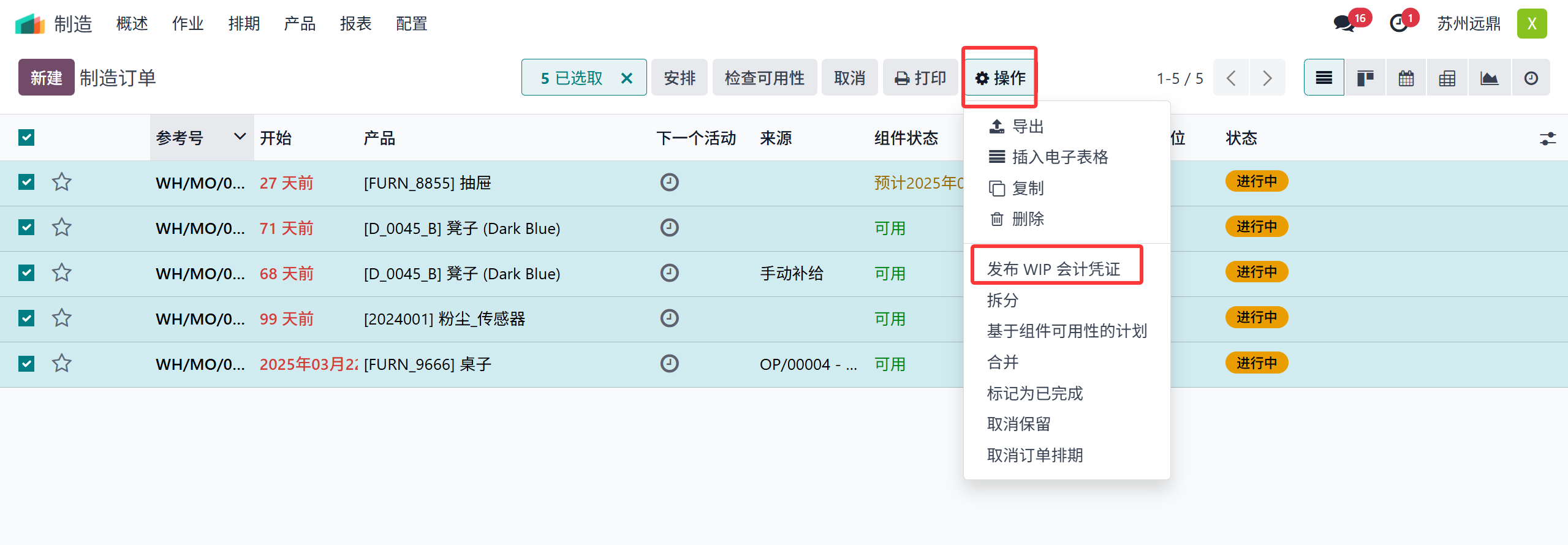 只需一次点击,即可为多个生产订单过账 WIP 会计记录。为此,请打开生产订单并选择所需的订单。订单状态应为"进行中"(In progress)。然后,如前所述,点击"操作"(Action) 按钮并选择"过账 WIP 会计凭证"(Post WIP Accounting Entry) 选项。
