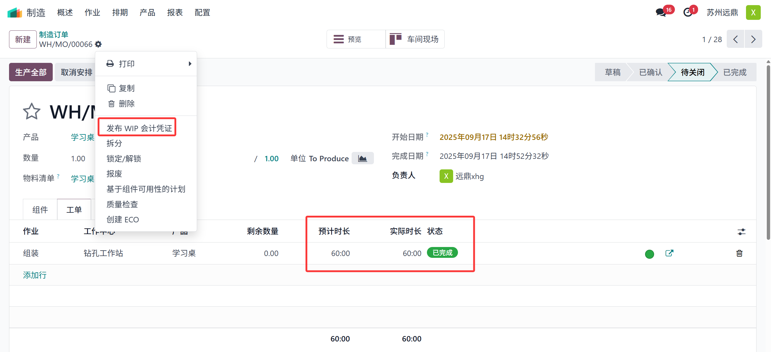 现在用户完成了操作。所以实际持续时间达到了预计持续时间,工作订单状态变为"完成"(Finished)。