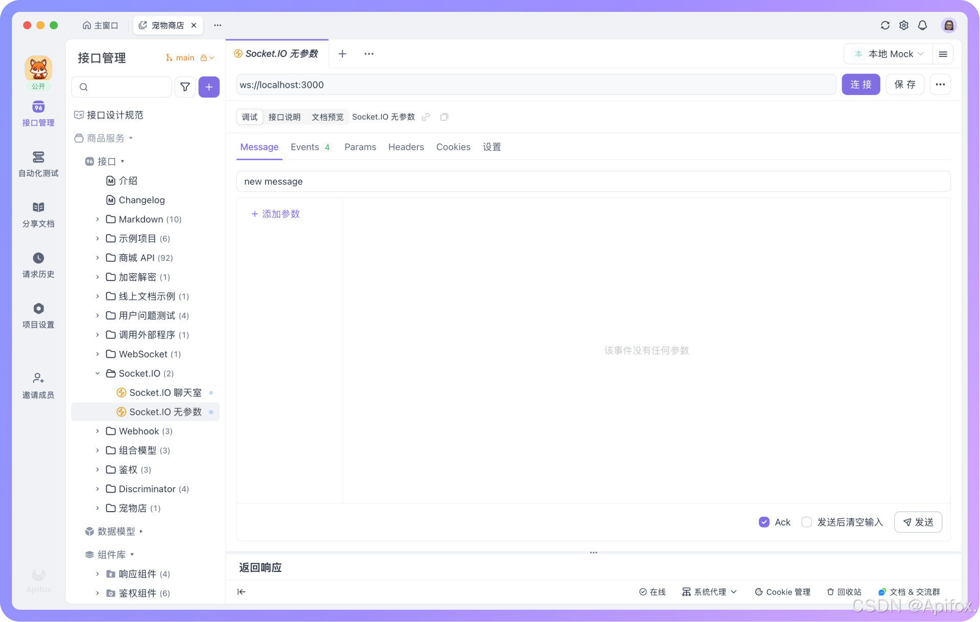 升级至最新版本的 Apifox 后,调试 Socket.IO 接口时,支持发送空消息和无参数消息,使开发者能够全面模拟和测试实时通信的各种场景。