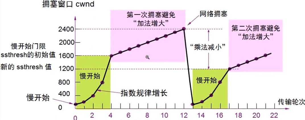 拥塞避免(加法增大):拥塞窗口缓慢增大,以防止网络过早出现拥塞