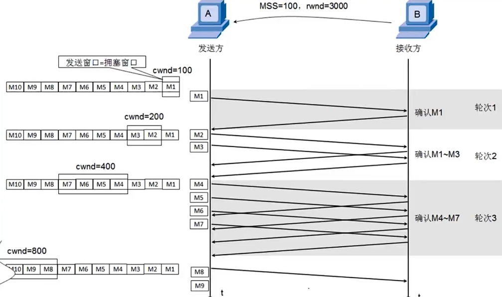 - cwnd的初始值比较小,然后随着数据包被接收方确认(收到一个ACK)