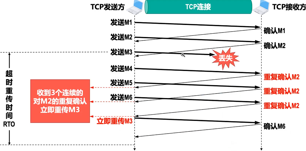 当M3丢包时,此时M4、M5等已经发送,正常来说,应该回一个SACK(选择确认)包,但是现在变了,继续重复确认M2(请求发送M3),当收到3个连续的M2重复确认,才会重传M3。而M4、M5、M6都会记录的(发送方有缓存),最后会确认M6。