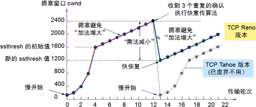 - 就执行"乘法减小"算法,把ssthresh减为拥塞峰值的一半
