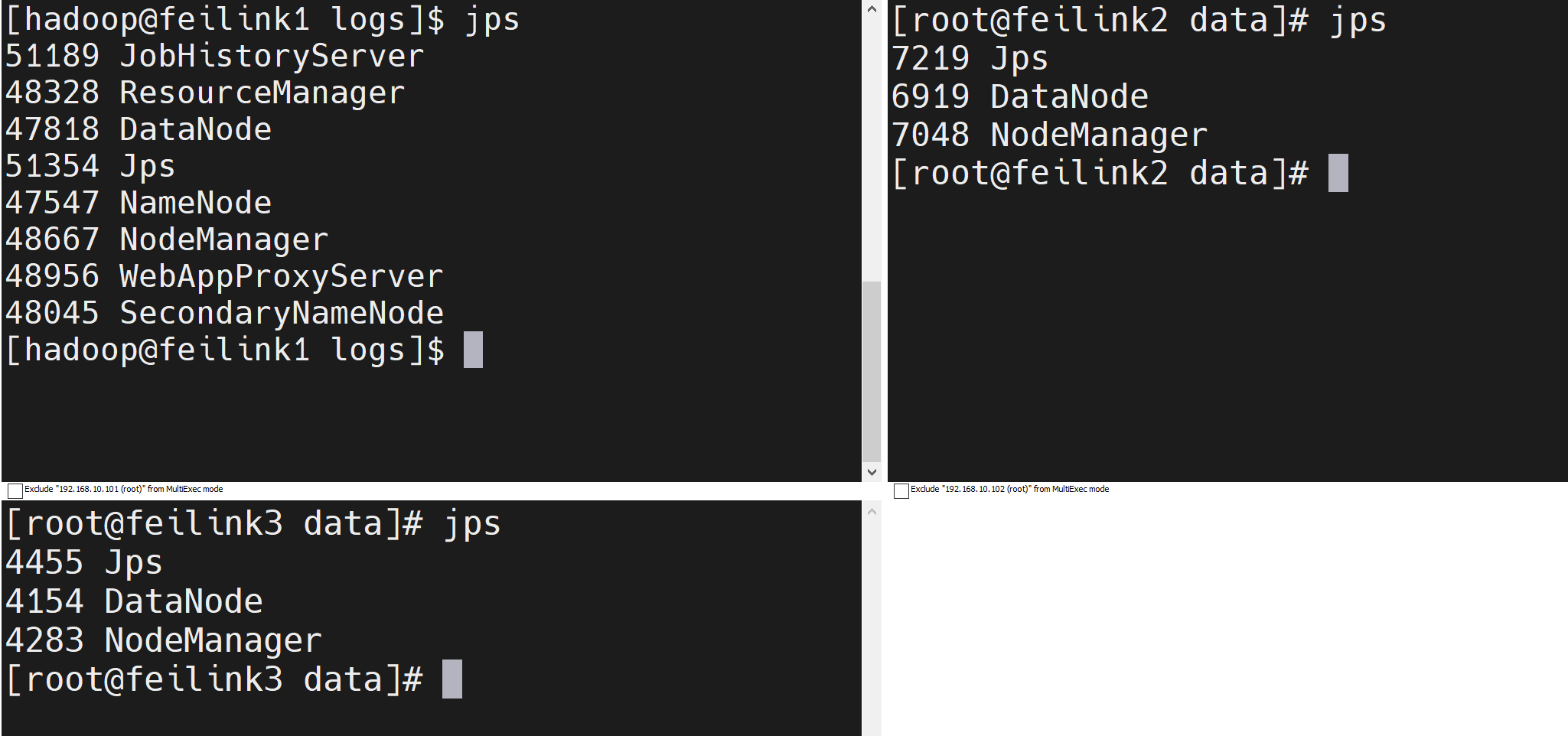 | feilink1 | NameNode、DataNode、SecondaryNameNode、ResourceManager、NodeManager、ProxyServe、JobHistoryServer |
