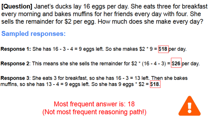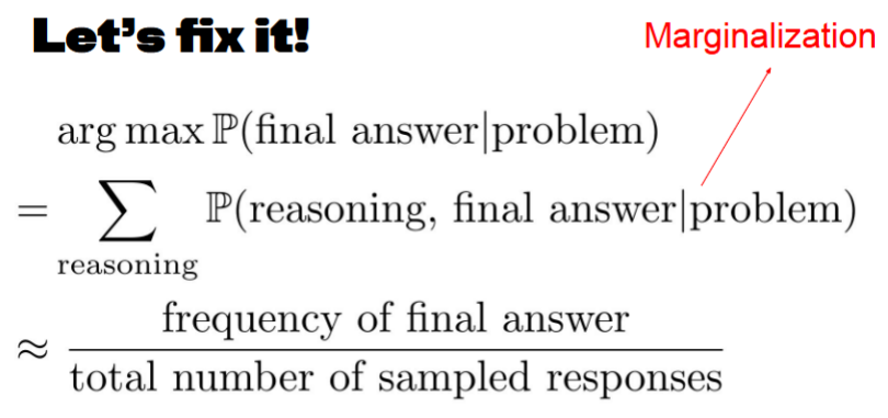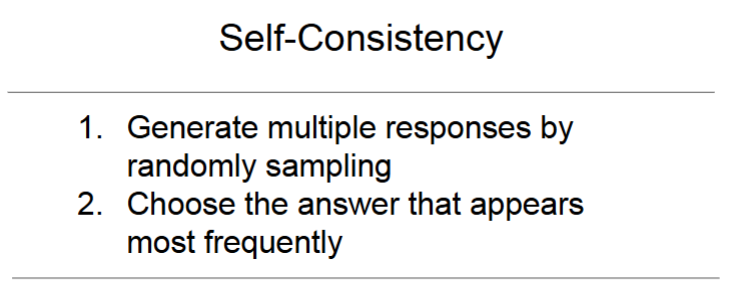 通过独立采样来近似概率分布。选择的是最频繁出现的答案。此即第一项技术:自洽性。