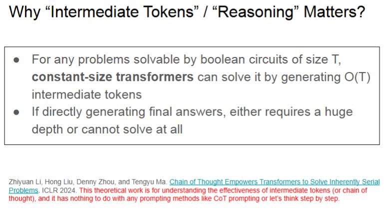 更重要的是,Denny Zhou的一项研究表明,对于一个可解的复杂度为T的模型,一个固定大小的模型可以通过生成O(T)的中间token(推理步骤)来解决它;但是如果直接生成答案,要么需要很深的网络,要么根本做不到这件事情。
