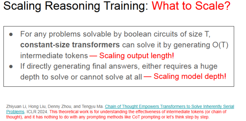 这张片子上讲的问题是,根据前面从计算理论分析模型reasoning能力的结论,如果我们想提升模型的能力,两个重要的指标就是提升输出长度以及提升模型的深度。