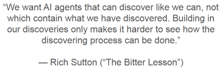 虽然在下面这张ppt中他完全没有说这个话。他说的是:"我们要的是像人类一样具备'发现能力'的 AI 智能体,而不是肚子里装满了人类'已经发现的知识'的机器。把我们的发现直接植入到 AI 中,只会让我们更难看清(或阻碍我们理解)真正的发现过程是如何实现的。"