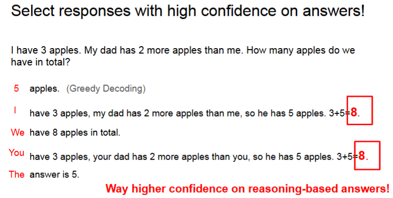 但是Zhou发现:包含了正确思维链的回答具有非常高的答案置信度。