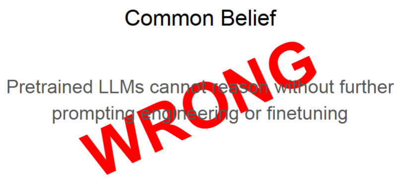 此前人们普遍认为,一个普通的、只经过预训练的大语言模型是不会推理的,必须通过思维链或者是微调才能够学会推理。