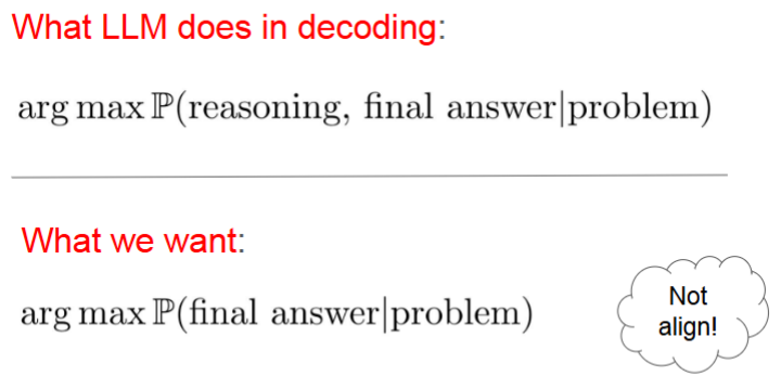 即选择思考过程+答案整个序列联合概率最高的那一个。这和我们想要的东西不同:我们只想要最好的回答。
