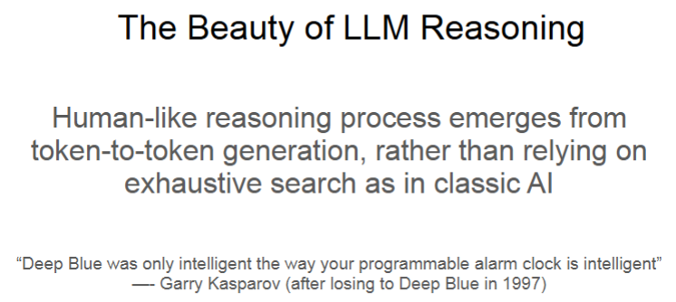 大模型展现出的智慧是来自于逐个token的预测,而不像是深蓝计算机(可能来自于穷举的搜索)。