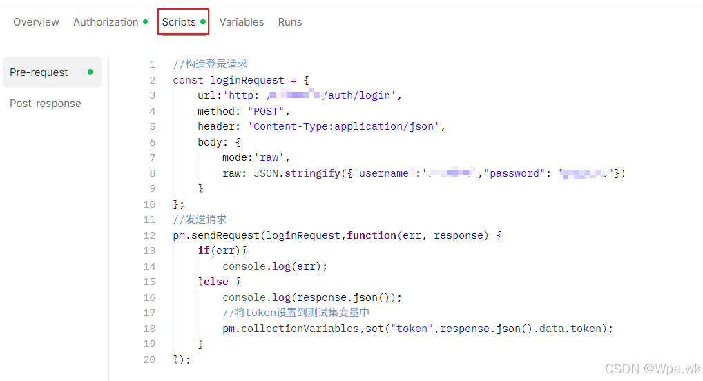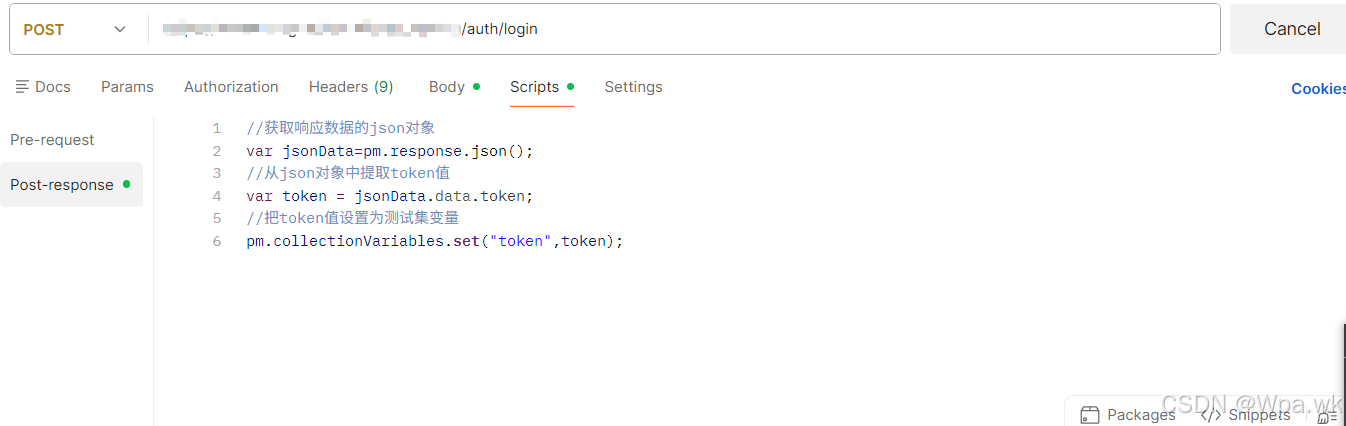 2.在登录接口中从响应中获取,需要创建脚本在Post-response中提取 - 使用JS脚本