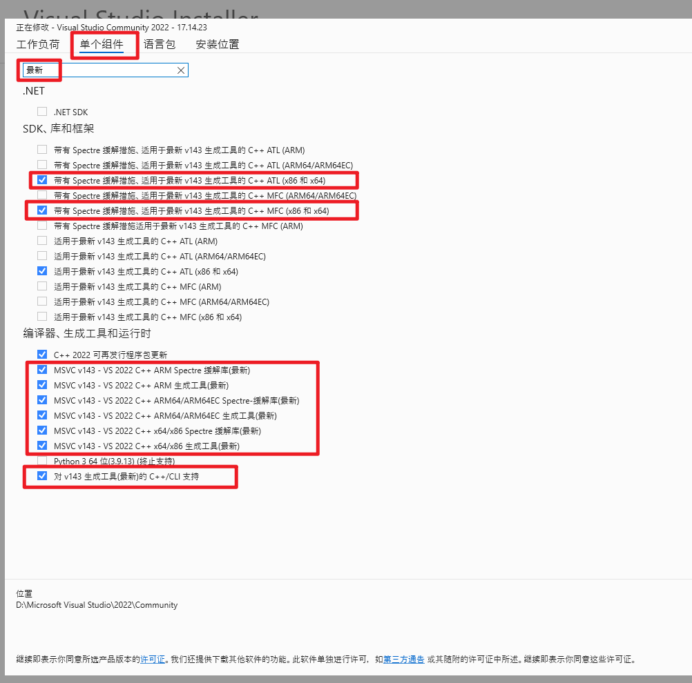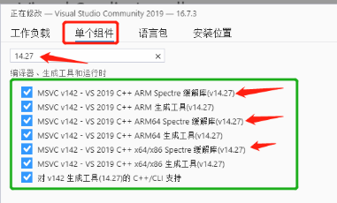 可以直接根据上述看到的MSVC版本号进行搜索。如下图,把【缓解】和【生成工具】都勾上