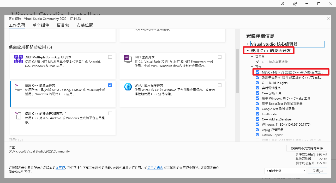 报错原因:我刚下载了Visual Studio新版进行编译,只勾选了最基础的【使用C++的桌面开发】(如下图),其他组件都没有下载。