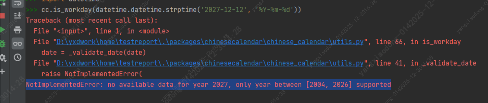 开发了一个测试报告生成工具,集成了日历库chinese_calendar,用来保证报告执行日期和结束日期在正常工作日时间。但该日历库会在每年年末,官方公布来年的法定节假日日期后进行更新,如未能更新致最新版本,会导致生成报告时日期处理异常。例如:1.11.0版本的日历库只能对2026年之前的日期进行处理,对2027年的日期进行处理时,会报NotImplementedError异常。