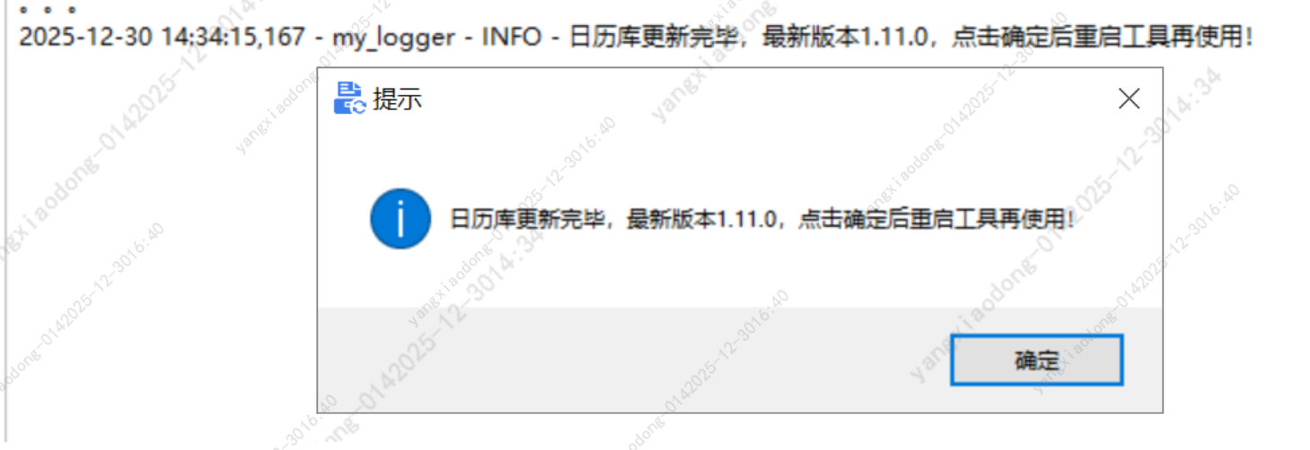 logger.info(r'日历库更新完毕,最新版本%s,点击确定后重启工具再使用!' % cc.__version__)