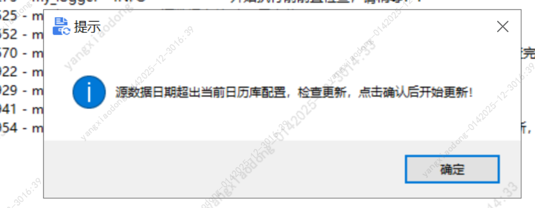 showinfo(r'提示', '源数据日期超出当前日历库配置,检查更新,点击确认后开始更新!')