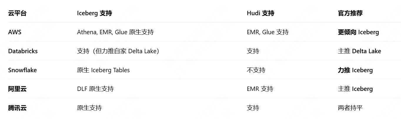 这里少了华为云,华为云支持 Hudi和 Iceberg,但华为云的湖仓一体架构是以 Hudi 为基础,应该是主推 Hudi。