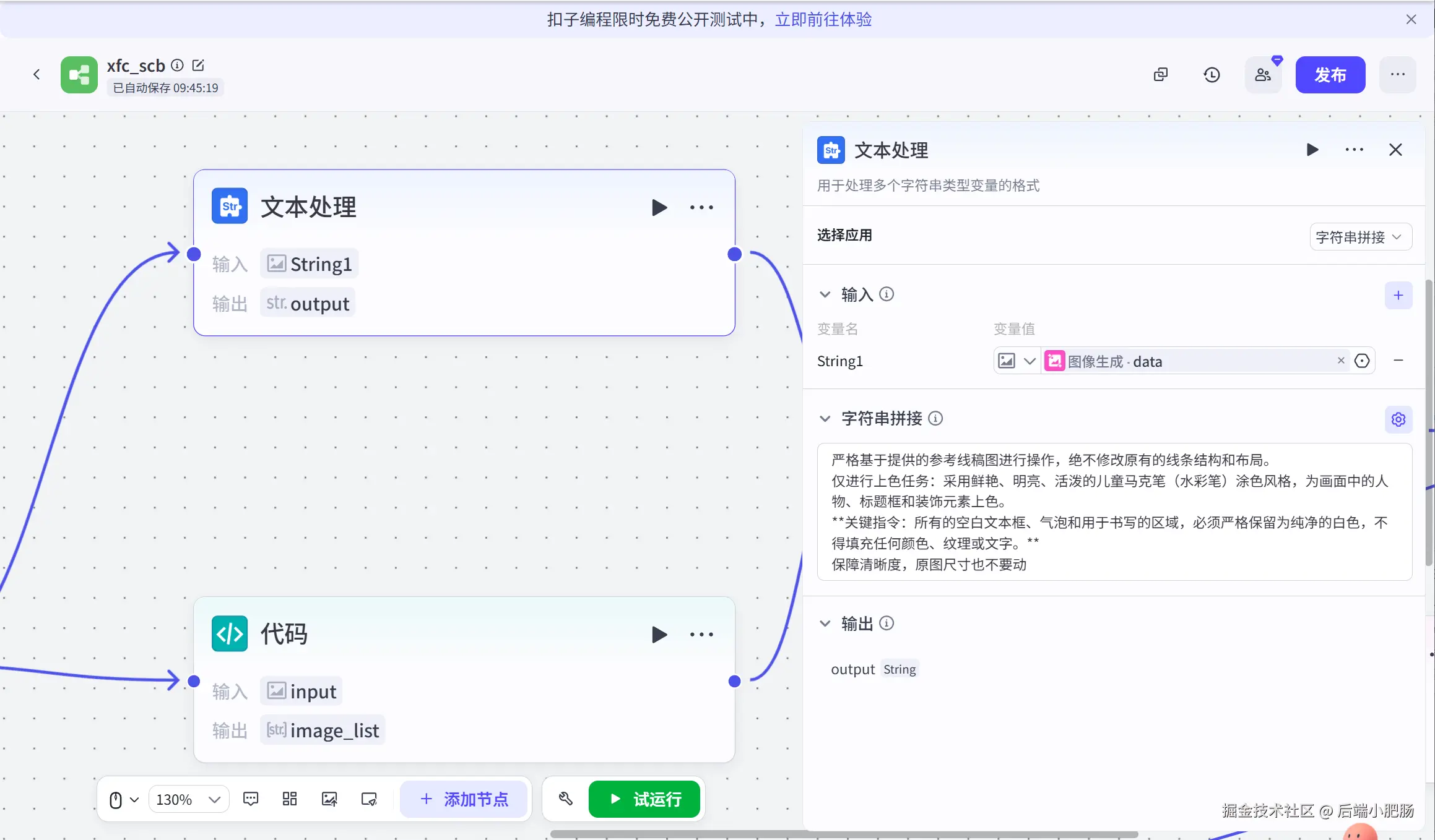 图像生成: 文生图提示词(大模型)节点后接图像生成节点,这个节点的作用的基于前置节点的文生图提示词来生成儿童画板线稿图。