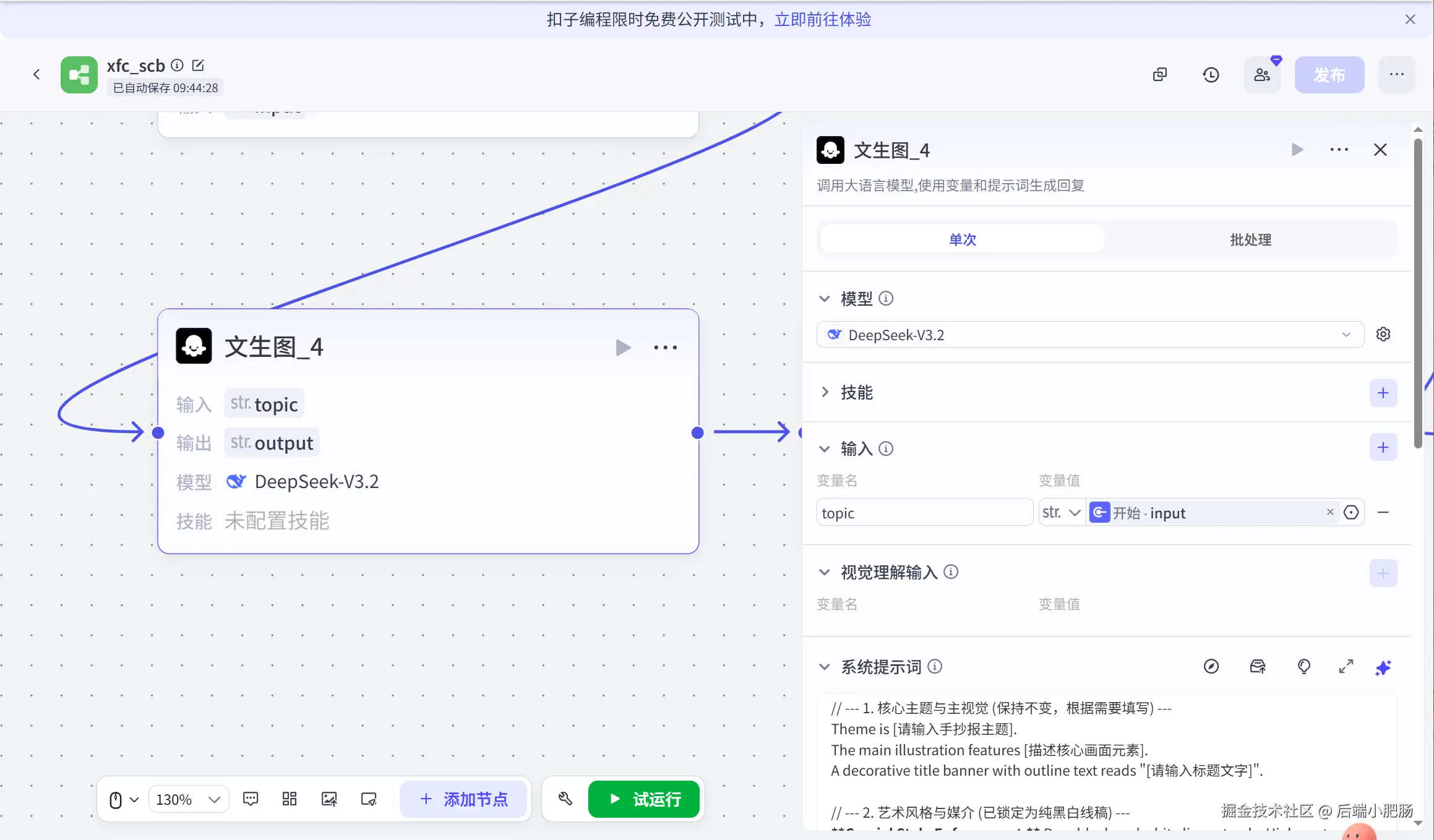 这类赛道玩法很简单,就是发布手抄报笔记然后挂橱窗即可。也就是昨天,我成功用 Coze + DeepSeek V3.2 跑通了全自动工作流。DeepSeek 3.2 强大的逻辑理解能力,配合即梦4的生图能力,让原本需要一小时的手绘工作,现在只需输入一个主题,点击【试运行】,几分钟直接出图。