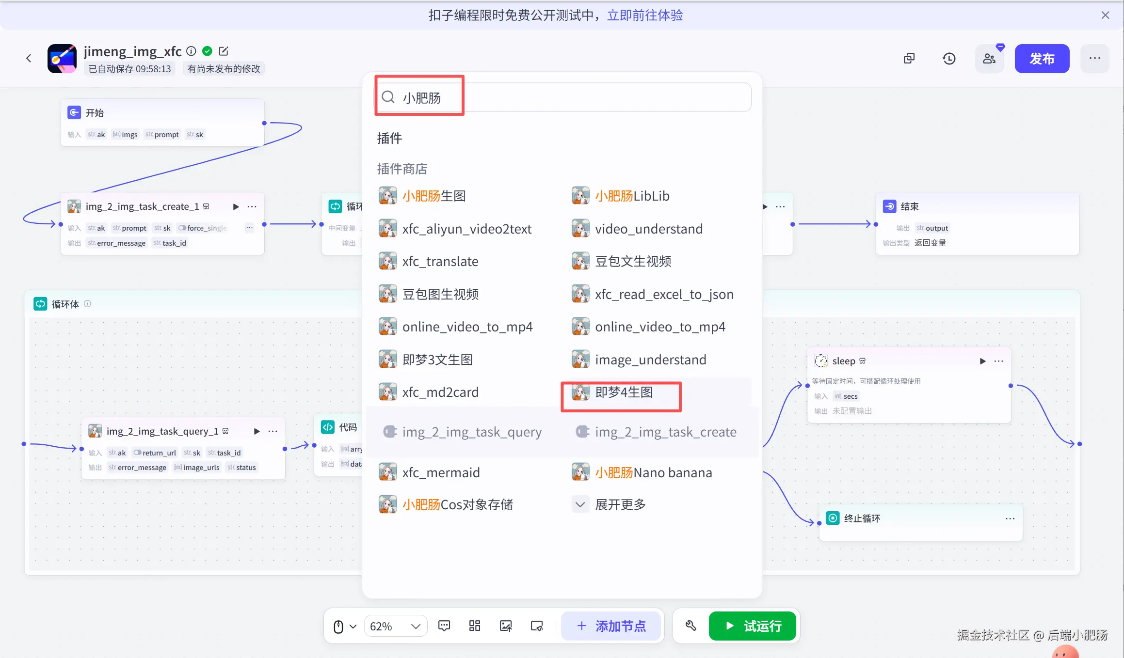 在上图中img_2_img_task_create 和img_2_img_task_query是我开发的即梦四生图插件,在工作流界面点击【添加节点】搜索小肥肠,即可使用: