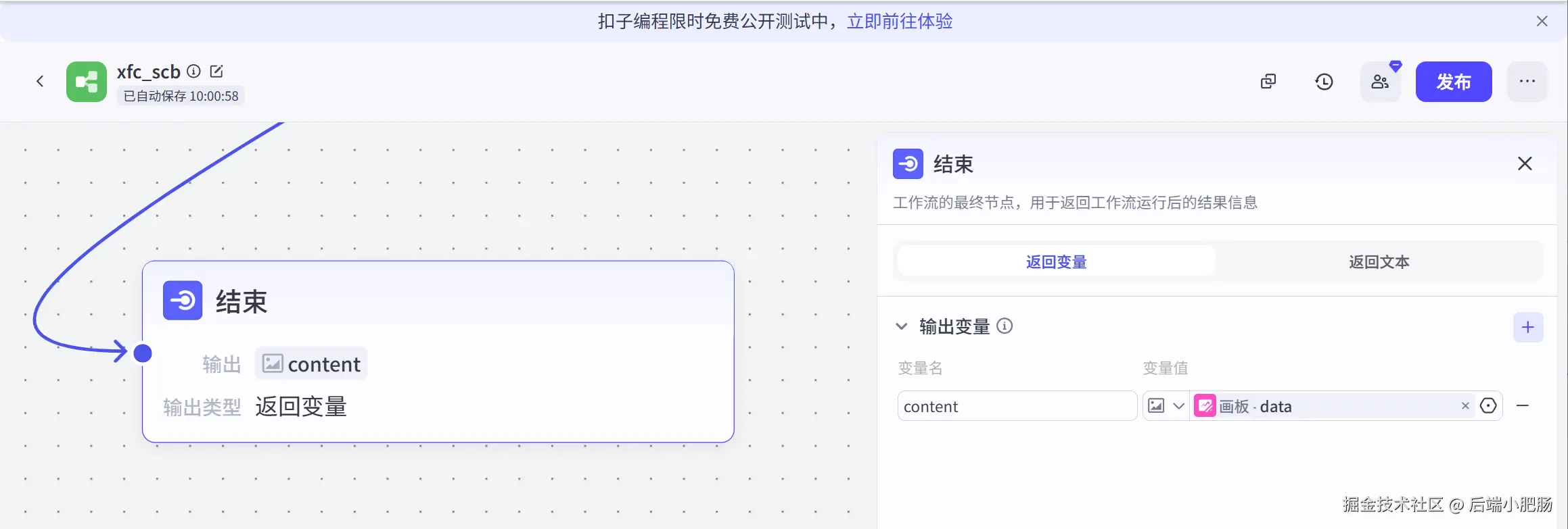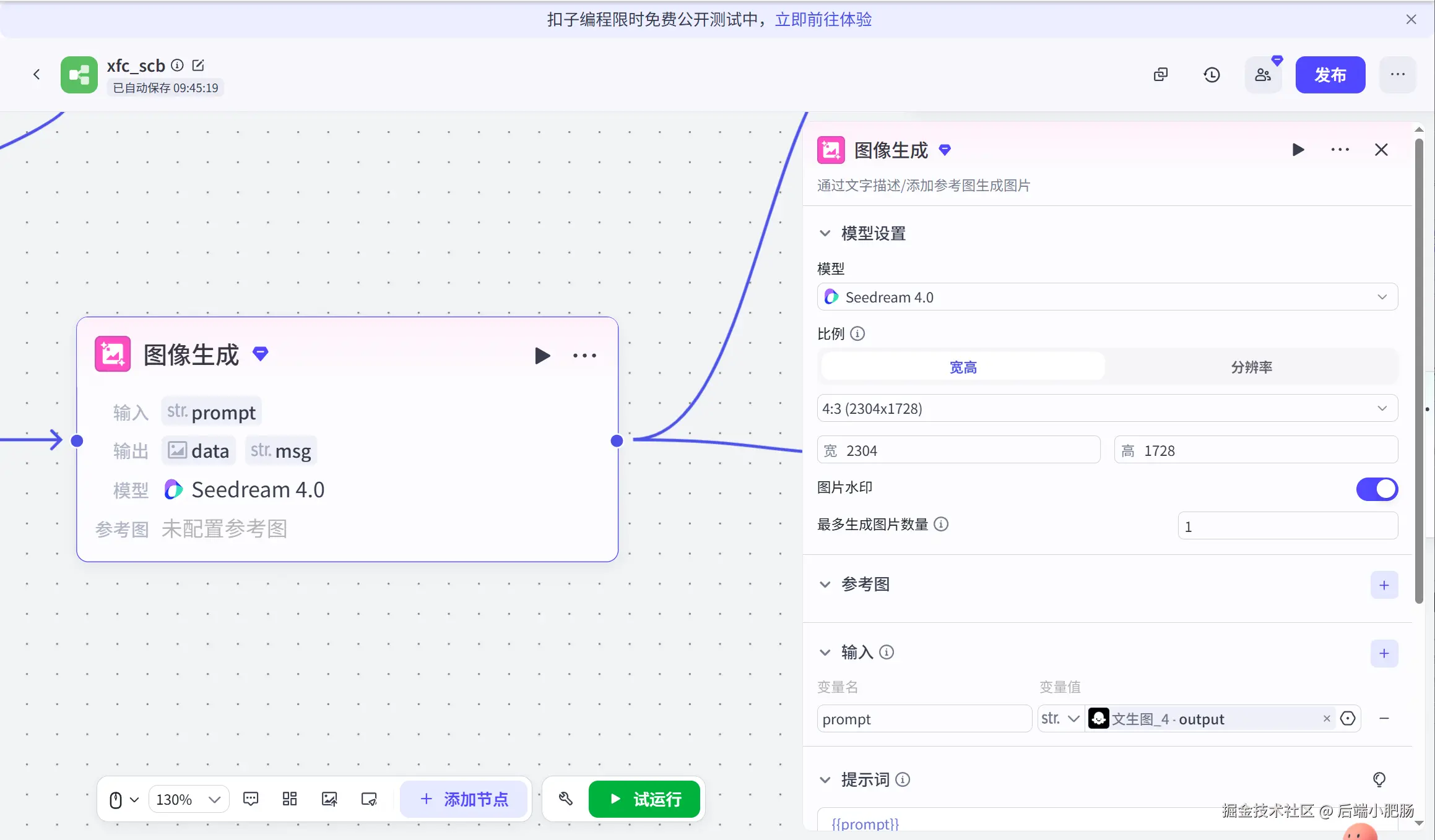 代码(将图像链接转换为数组): 图像生成节点出来后接代码节点,这个节点的作用是将图像链接转换为数组形式,这么做的目的是为了适配即梦4插件生图的格式。