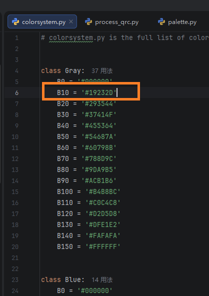 而Gray.B10,则是在QDarkStyleSheet-master/qdarkstyle/colorsystem.py中定义的,它是所有主题共用的:
